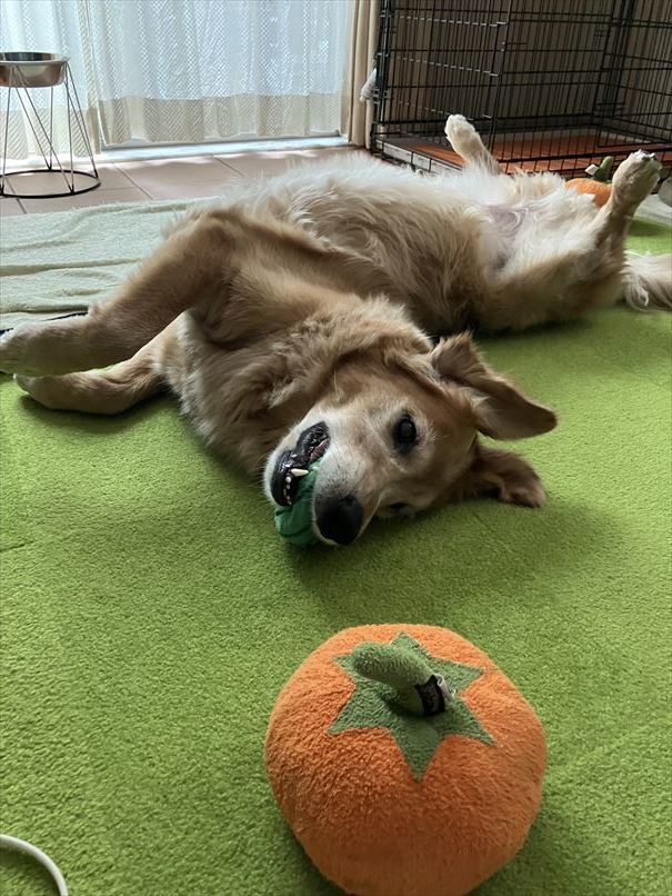 来て数日ですっかりリラックス。大型犬なんてチョロイらしく(笑)