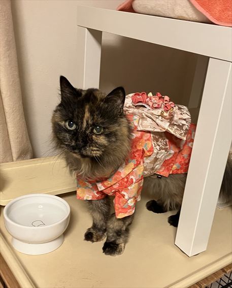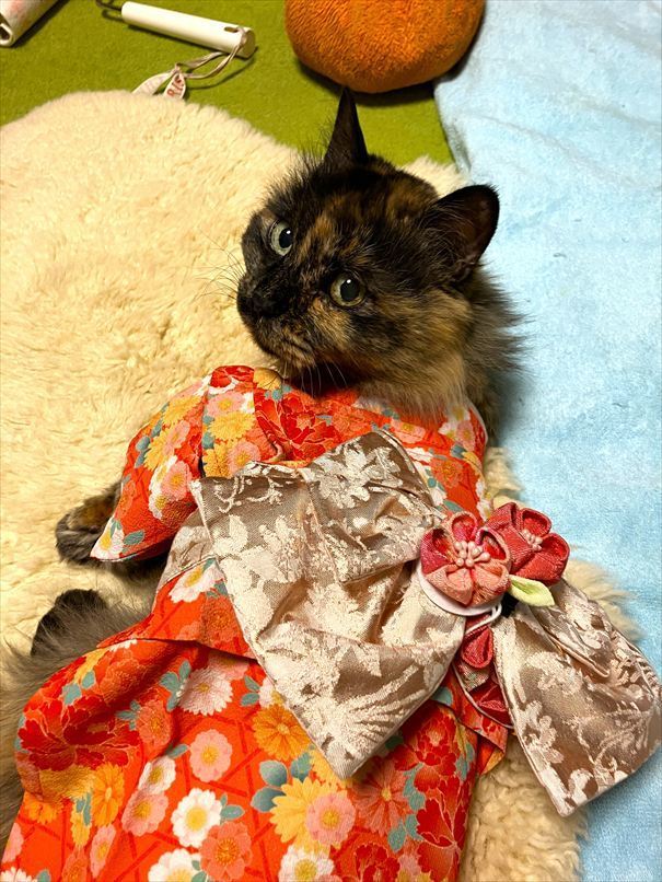 二十歳の門出をお祝いして、お振袖を買いました。猫ちゃん用のサイズもあるんですよ。生地の色はとても迷ったのですが、オレンジ系のお着物にしたらばっちりお似合いでした。